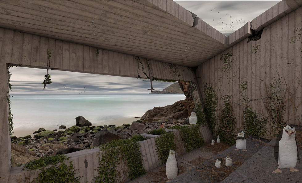 Within the architectural facet of this project, observation hides strategically placed at key points of interest such as Sandfly Bay, Penguin Beach, and a few remaining gun emplacements. These hides would be maintained as a community and serve as repositories for plant saplings, allowing visitors to participate in the rewilding efforts as they depart. An intriguing aspect of the hide design revolves around the concepts of permanence and impermanence.